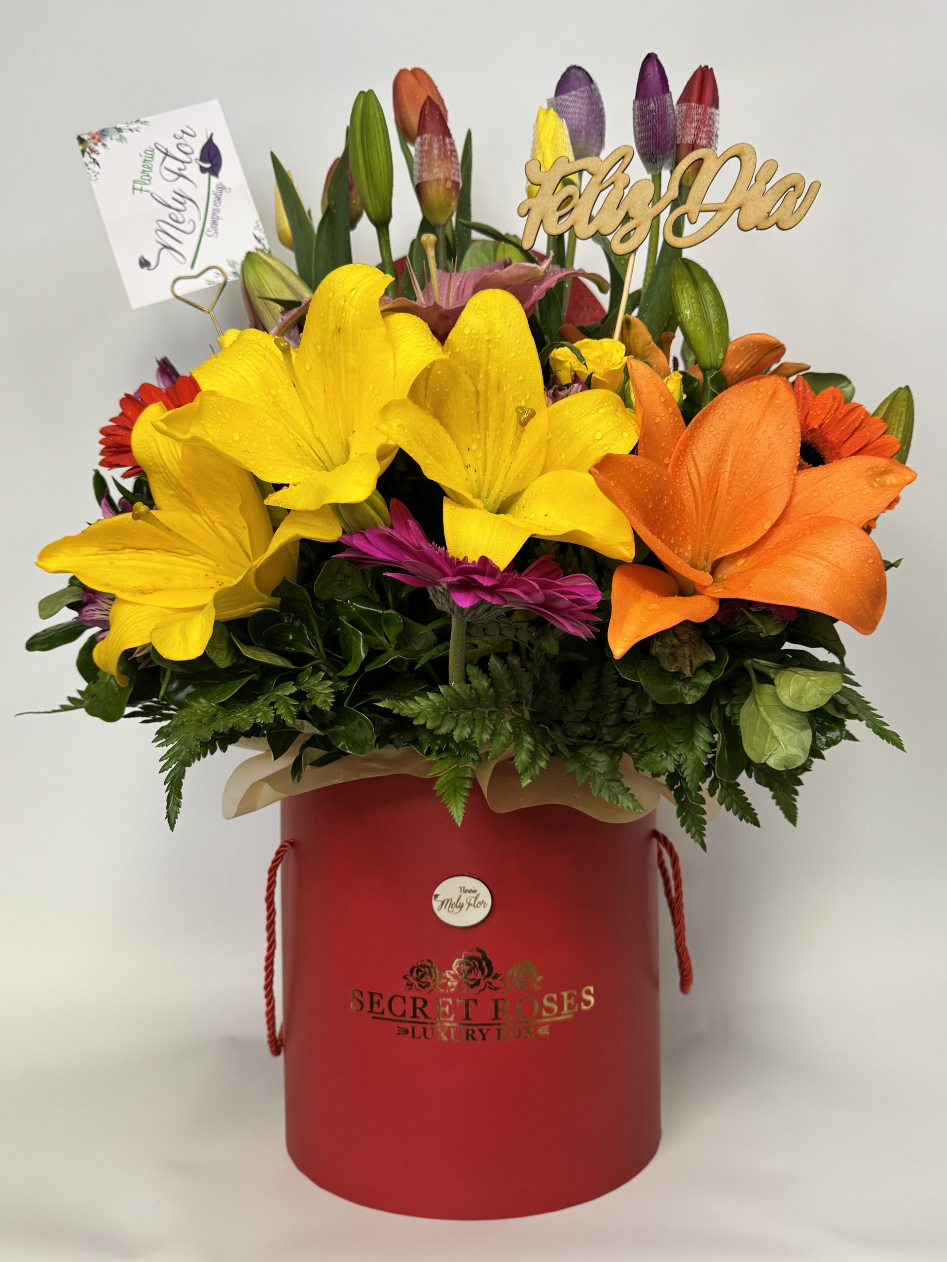 8 TULIPANES DE COLORES, LILIUMS, GERBERAS, MINIROSA Y FOLLAJE EN BOX (COLOR DE MINIROSAS, FOLLAJE Y TIPOS DE BASES SUJETO A STOCK)